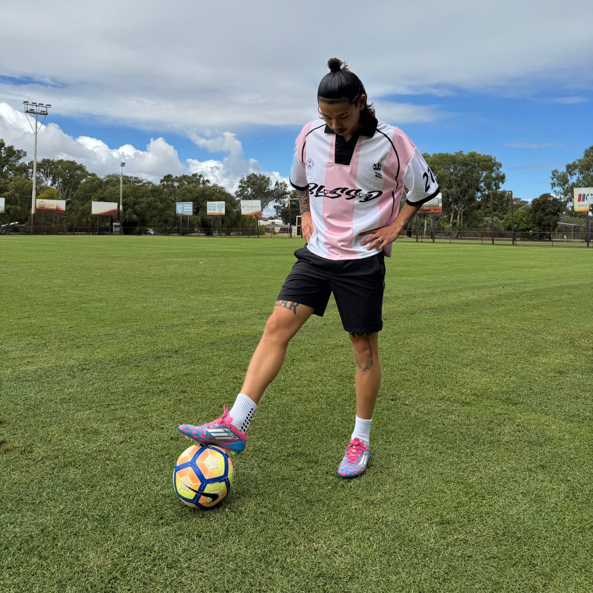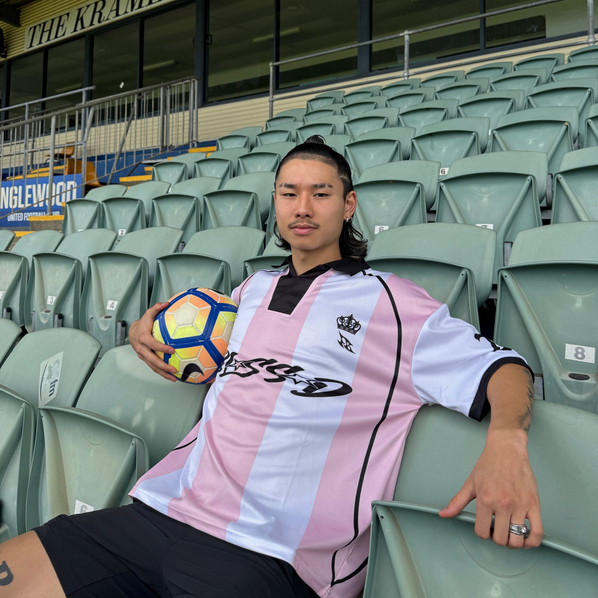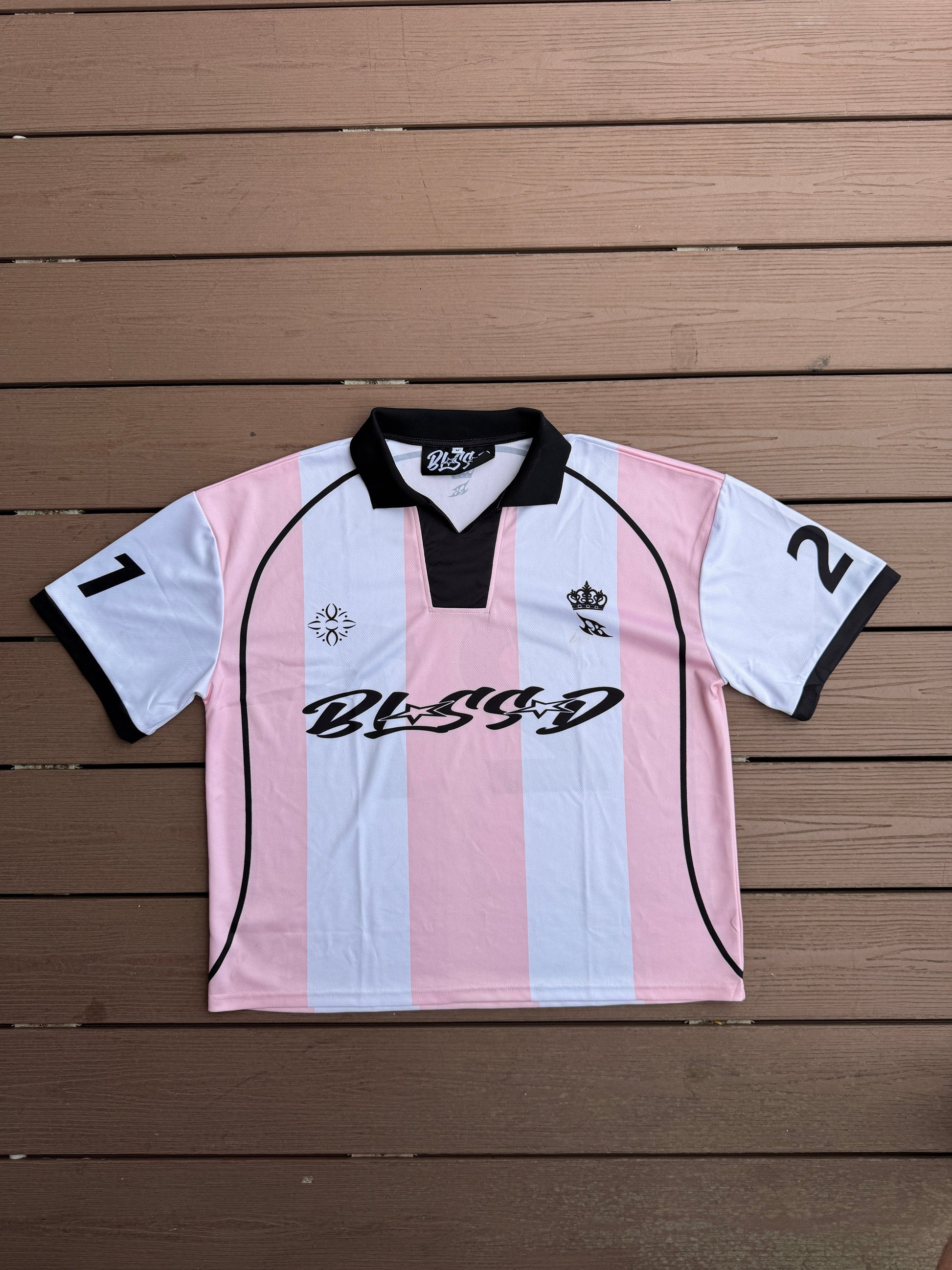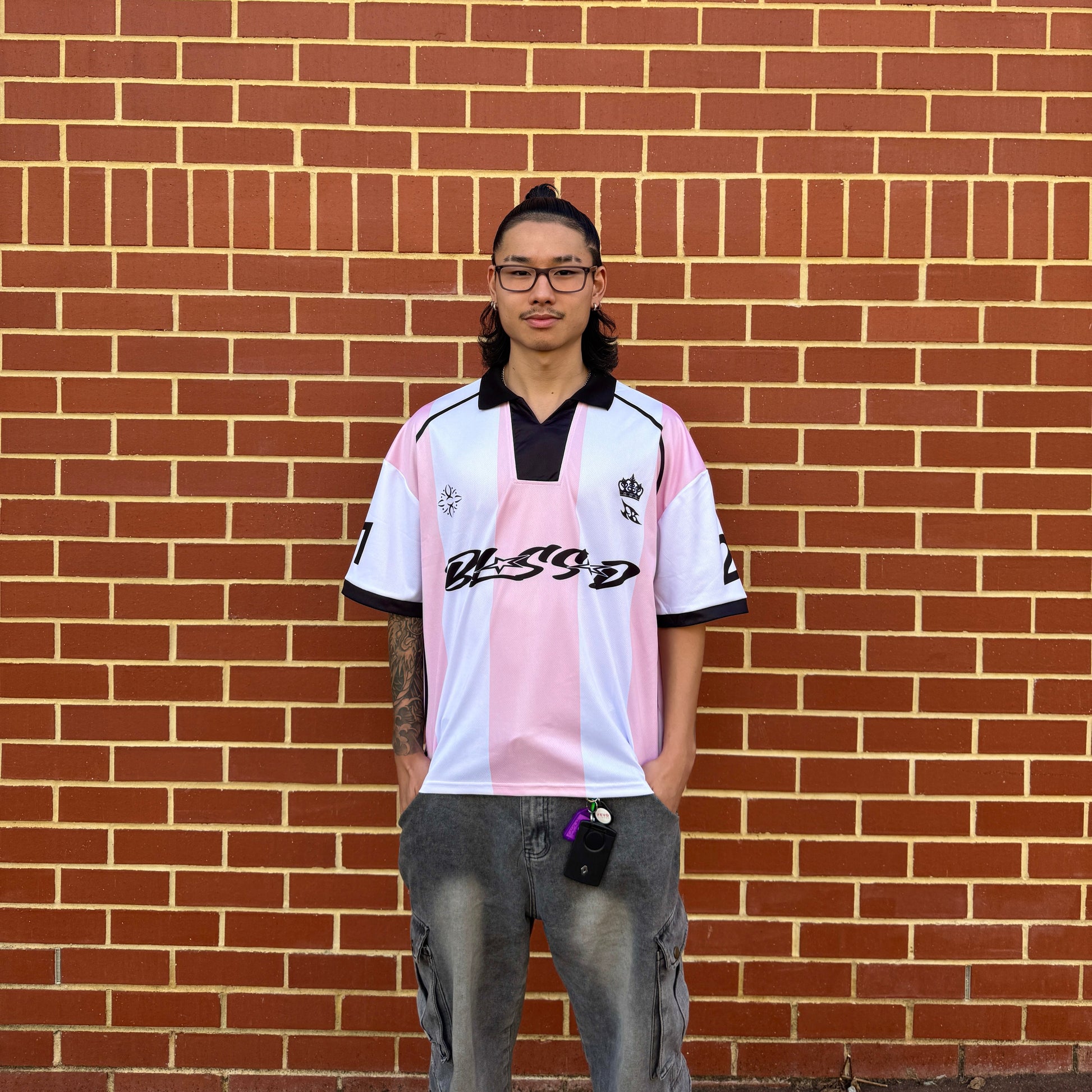 Step onto the pitch or the streets in style with the Blessed Striped Football Jersey – a fusion of vintage football aesthetics and modern streetwear. Designed for ultimate comfort and performance, this jersey features a pink and white striped body, bold black detailing, and a premium sublimated Blessed logo across the chest.